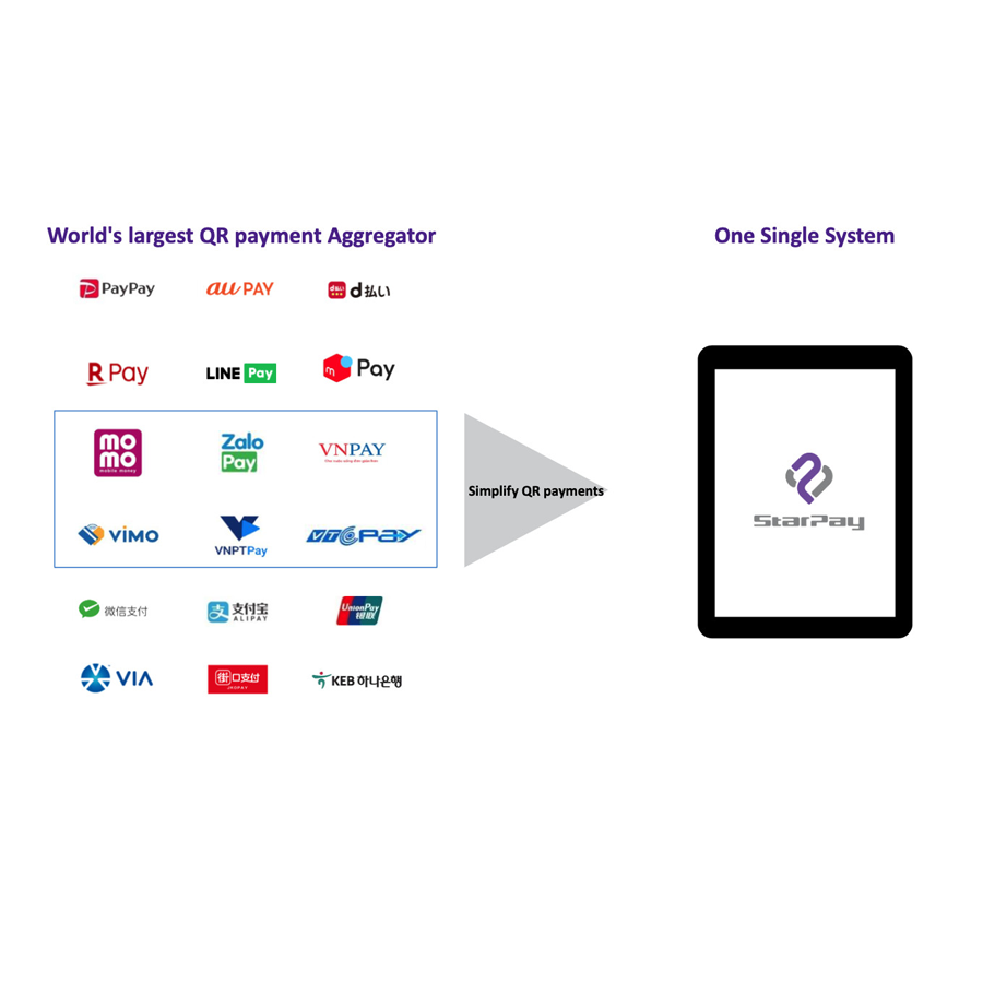 Starpay is a non-cash payment solution, integrating payment channels by QR code on a single application, allowing the store to accept payments from customers by any e-wallet or banking application which have been integrated in Starpay.